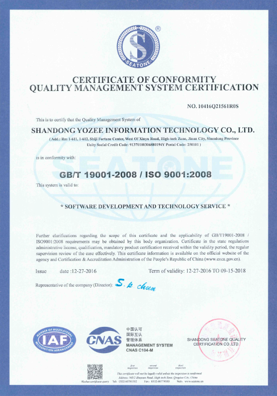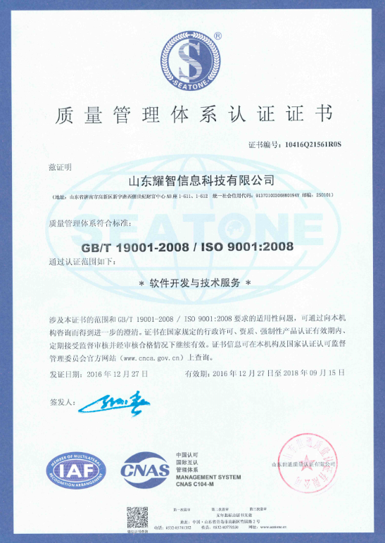 山東耀智信息科技順利通過 ISO9001:2008質(zhì)量管理體系認(rèn)證